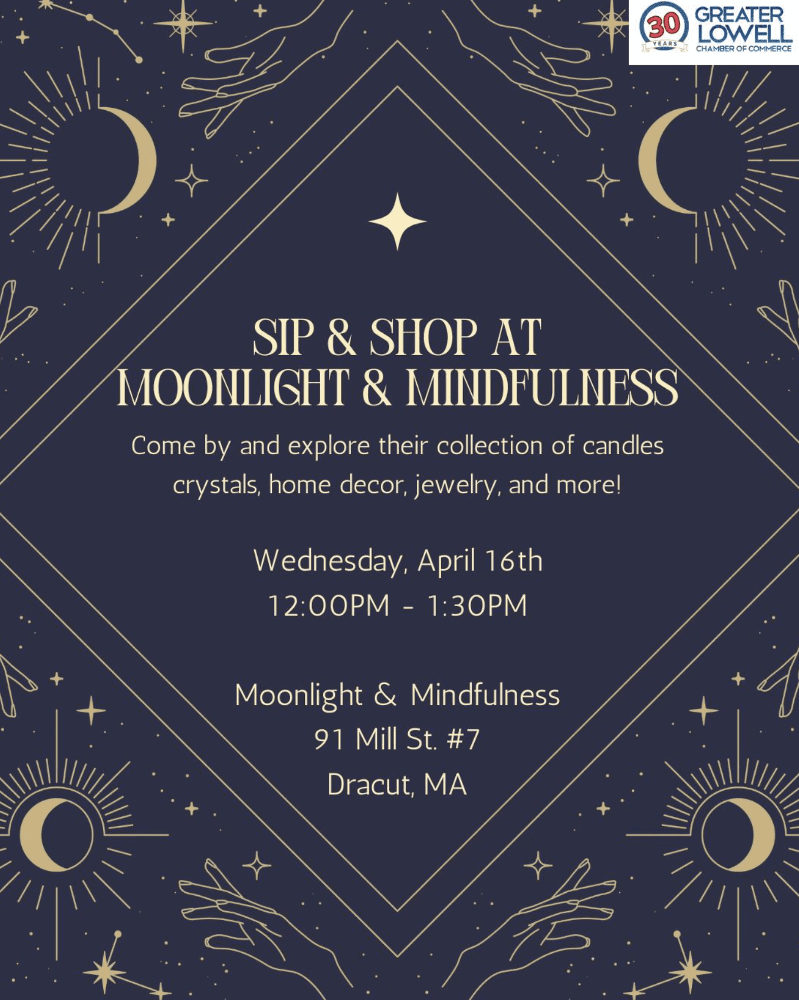 Join us Wednesday, April 16th for our Sip & Shop from 12-1:30pm at Moonlight and Mindfulness! Come by and network with others, enjoy some complimentary tea from our extensive organic tea collection, and participate in a scavenger hunt around our shop! Light snacks and refreshments will be served.