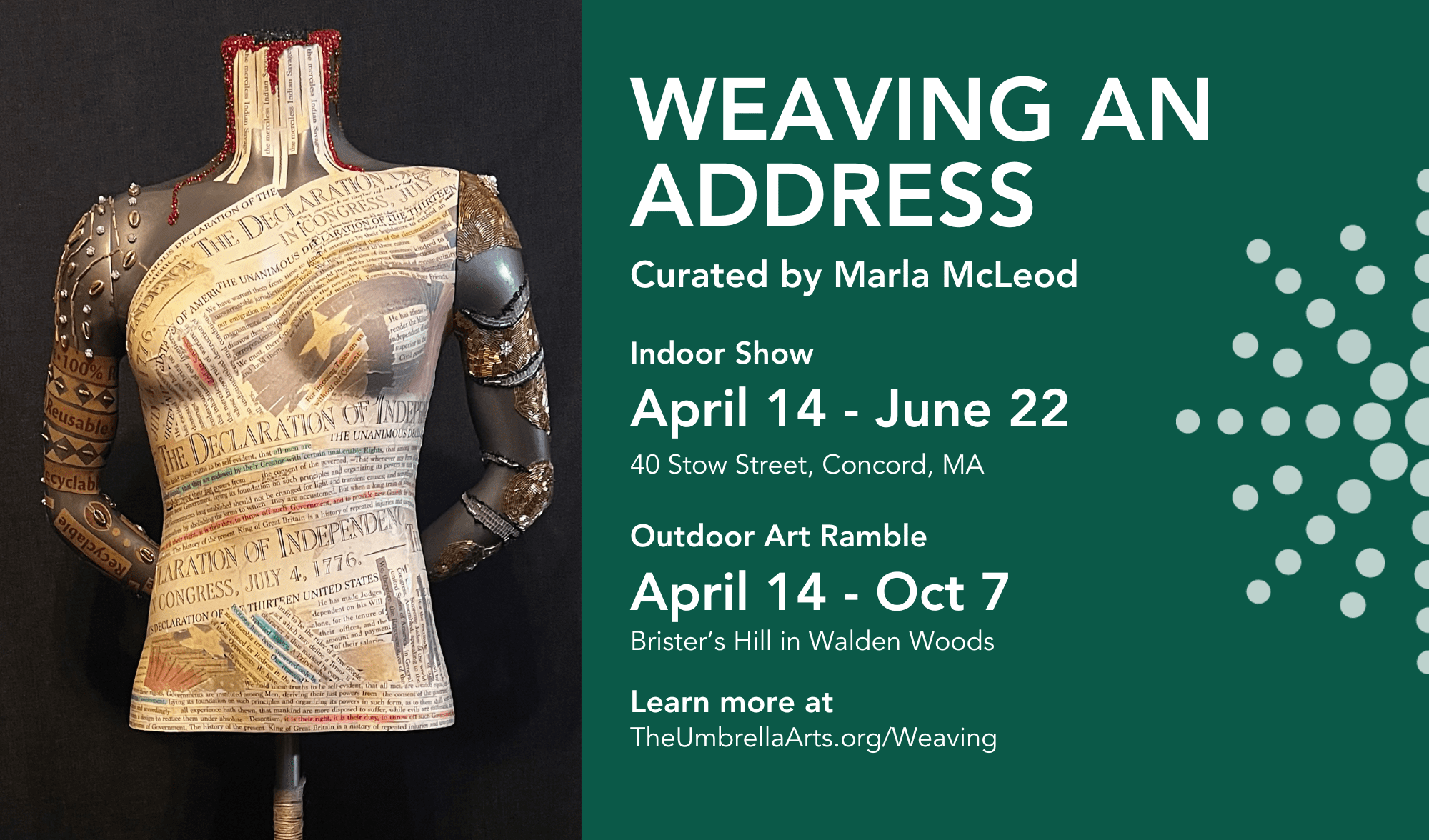 Exhibition: April 14 - June 14, 2025 Opening Reception April 14, 6PM The Umbrella Arts Center in historic Concord Center will commemorate the semiquincentennial of the American Revolution and “the shot heard round the world” with an ambitious outdoor/indoor public and gallery art exhibition, Weaving an Address, curated by artist Marla McLeod. For the first […]